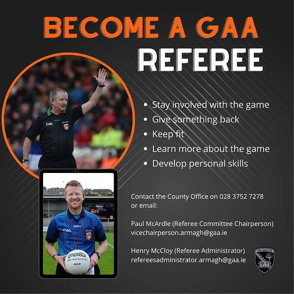 We are supporting Armagh GAA's referee recruitment drive and encourage any interested member to contact our club secretary or committee member.